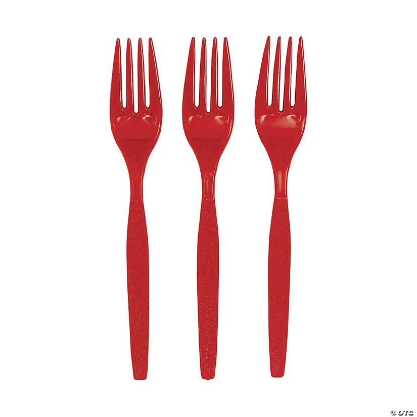• All Occasion Use: Includes 50 bulk red plastic forks for all styles of gatherings, from holiday parties and Independence Day parties to birthdays and barbecues!• Add Flair to Your Get-together: These red plastic forks are the ideal party supplies to jazz up any party. You can wash them for reuse or toss them for easy cleanup.• Construction and Care: This bright red cutlery is made of durable plastic. We recommend hand washing them if you reuse. • Your Party Superstore: We are your one-stop party shop! Come to Oriental Trading for all of your party supply needs, from party decorations to tableware to party favors and more.Product Description: Add some fiery flash to your next gathering without emptying your wallet when you choose these affordable bulk plastic forks. They’re made of durable plastic and are a bright, cheerful addition to any casual table setting! Specs: Quantity: 50Material: Plastic
