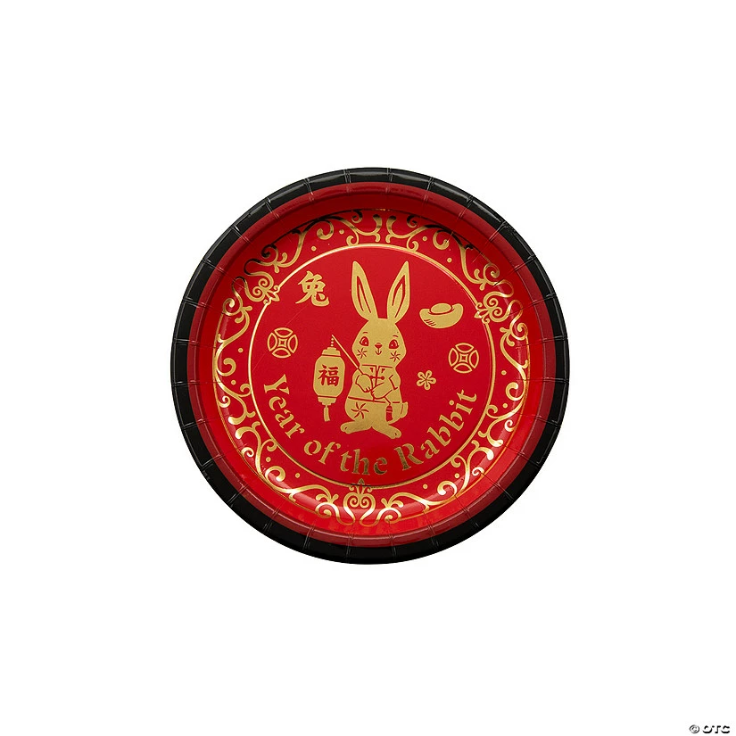 Your rice dumplings, sugar rings, fried dough twists and steamed sponge cake will look delectable served up on these ornately decorated party plates! Perfect for any 2023 Lunar New Year party or celebration, these festive plates feature a cute bunny amidst gold filigree to denote the Year of the Rabbit. Paper. (8 pcs. per unit) 7″ Not microwave safe. ยฉ OTC