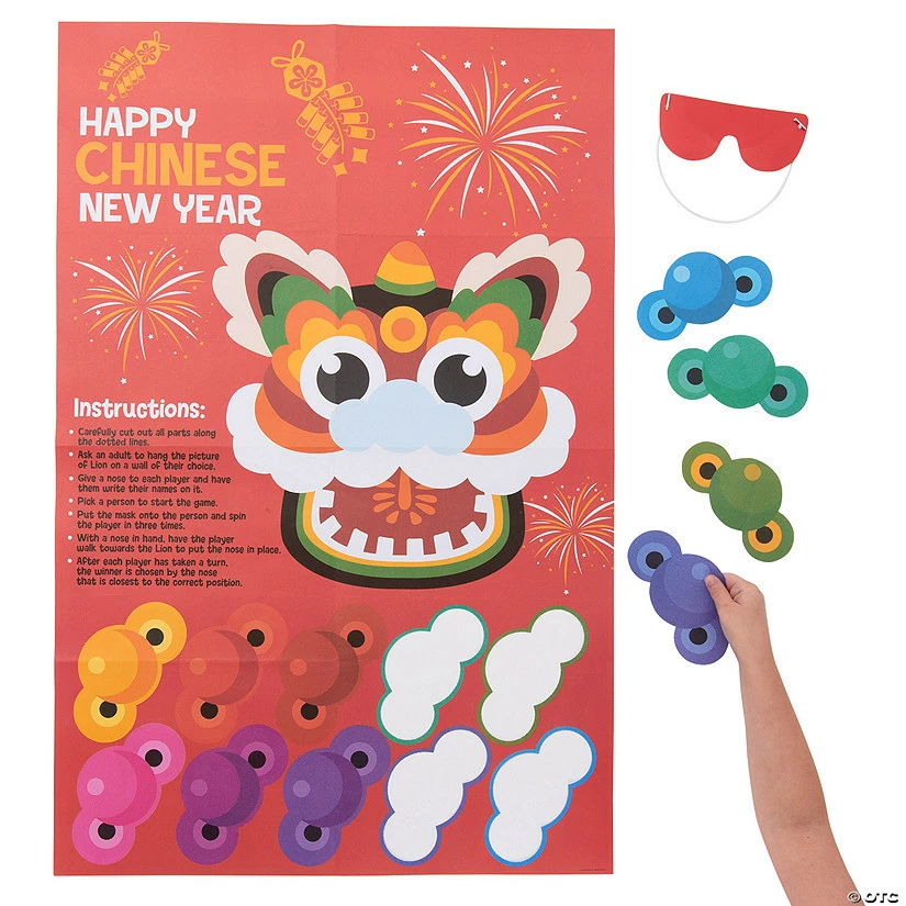 Itโs time to celebrate but this lion needs some help finding its nose before it can go! This classic game is a fun addition to a Chinese New Year party for kids and adults. Simply put the blindfold on the player and give them a little spin. The person whose nose is closest to the correct position wins. Donโt forget to grab some party favors and prizes from this website! Includes a cardboard blindfold with elastic band and 10 noses. Paper. (2 pcs. per set) 22″ x 33 1/2″ ยฉ OTC