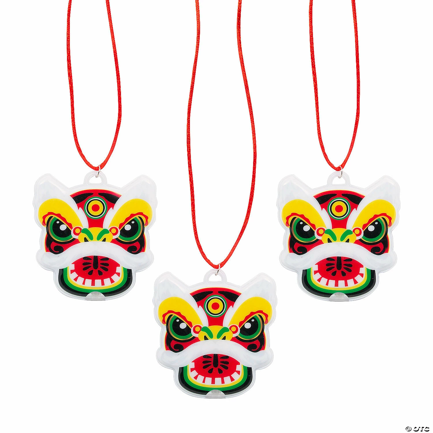 Add these fun necklaces to your Lunar New Year celebration supplies and watch the fun light up! Each necklace features a colorful dragon icon that lights up when squeezed, bringing not only good luck to partiers, but some light as well. These wearable Lunar New Year accessories are great as party favors or for handing out to kids as Lunar New Year giveaways. Plastic. 3″ icon on a 24″ breakaway cord. Includes batteries.