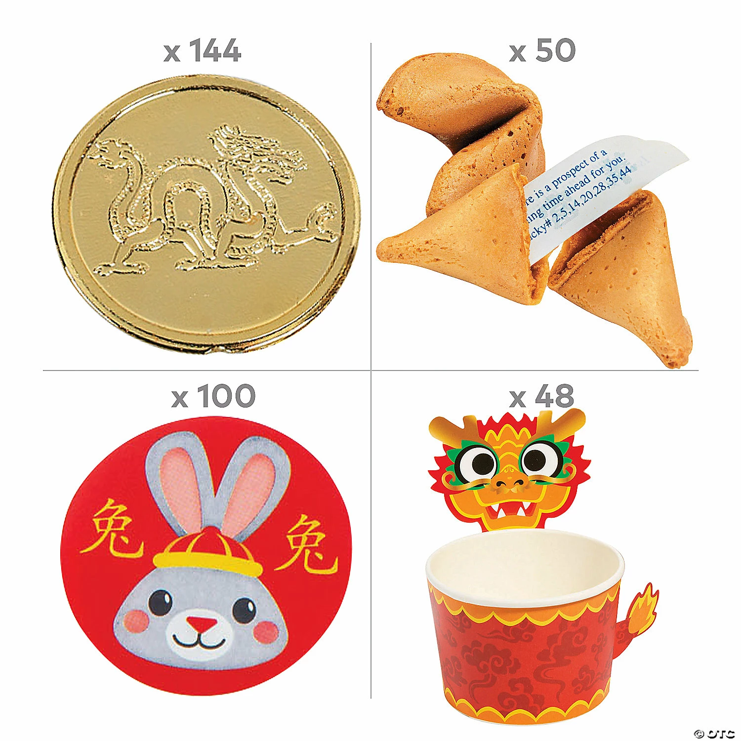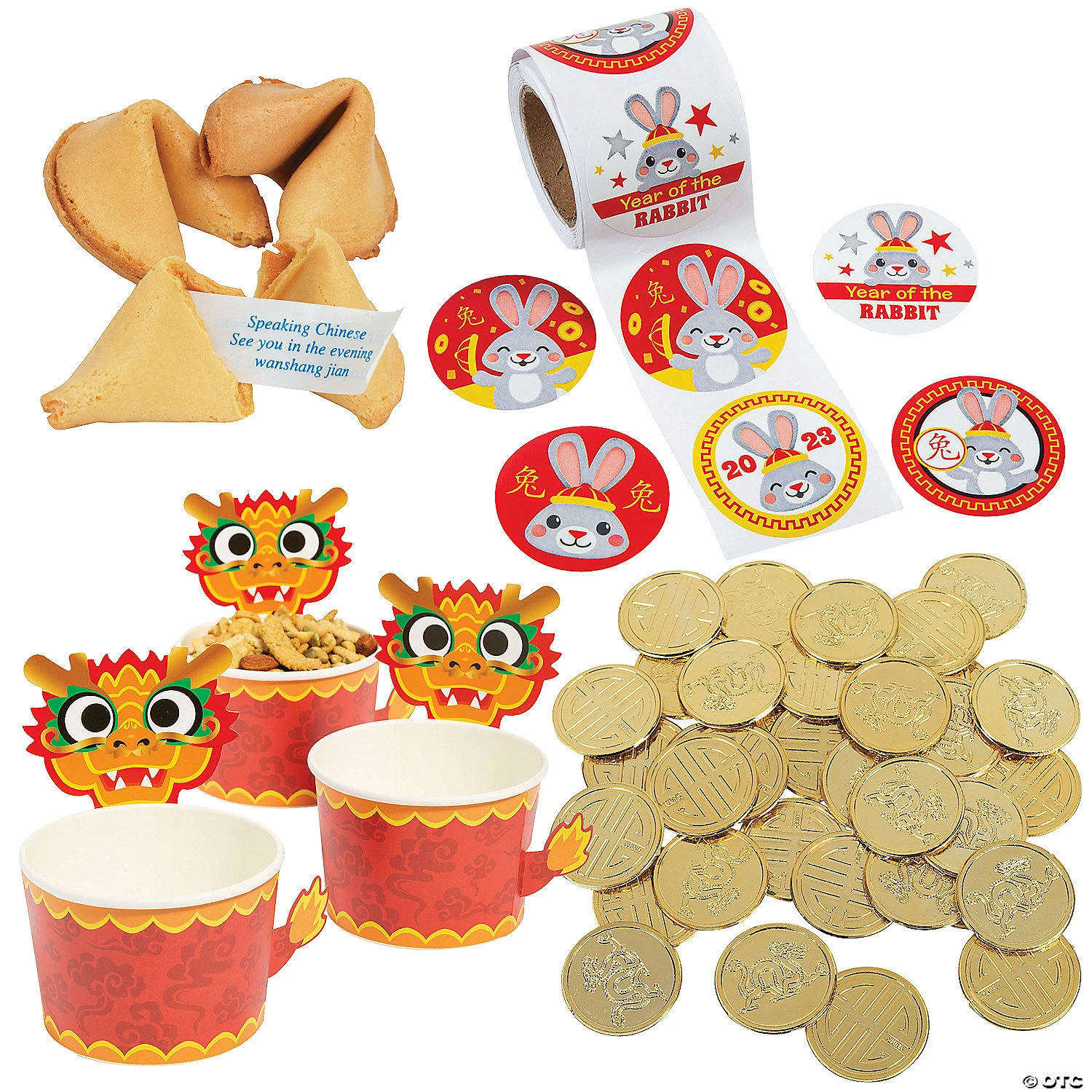 Celebrate the Year of the Rabbit with these awesome party favors. This convenient kit provides the perfect handouts for guests at your Lunar New Year party. Shop our site for coordinating disposable tableware and decorations to finish up your party planning. (243 pcs. per unit)Includes:โข 48 Paper Lunar New Year Chinese Dragon Snack Cups (4โ x 5โ)โข 144 Plastic Chinese New Year Goldtone Coins (1 1/4″)โข 50 Lunar New Year Fortune Cookies (Total wt., 12 oz. Individually wrapped. Dairy-free and nut-free. Kosher Edibles are non-returnable. For more information, visit our โReturn Policyโ page located on our website.)โข 1 Roll Paper Lunar New Year of the Rabbit Stickers (1 1/2″ 100 pcs. per roll, shrink-wrapped.)โข Assortments are subject to change at any time and may vary from picture shown. Substituted items will be similar in nature.