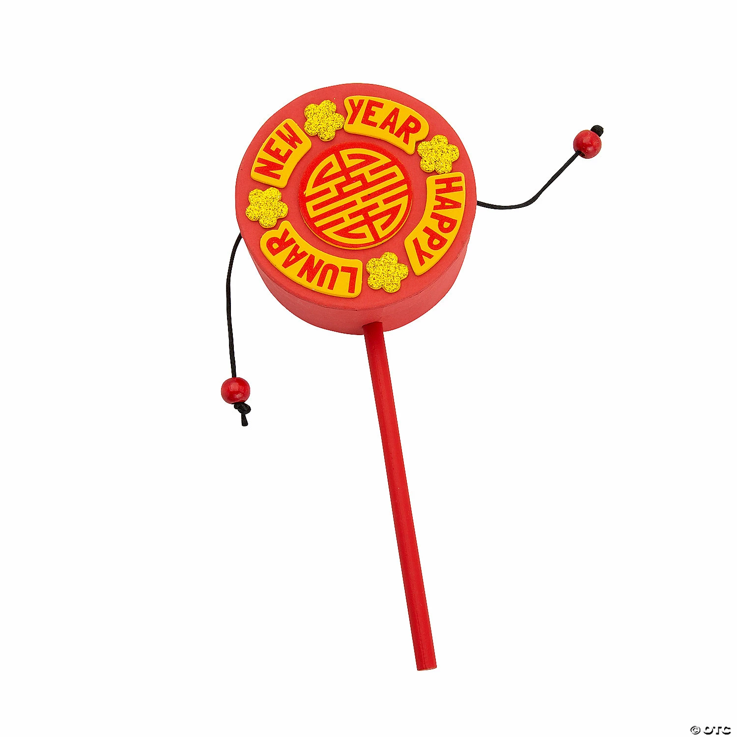 Kick off the new Lunar Year in celebratory style with these fun buildable drums! Kids will love putting together these red and gold colored spin drums as a craft at school, daycare or home. Once itโs built, children can test their new musical creation by seeing how fast they can spin the beads to beat on the drum. Includes self-adhesive foam pieces, paper mรขchรฉ boxes, satin cording, wood beads and wood handles. 8 1/4″ x 9″ All craft kit pieces are pre-packaged for individual use. Kits include instructions. ยฉ OTC Lunar New Year Drum Instructions