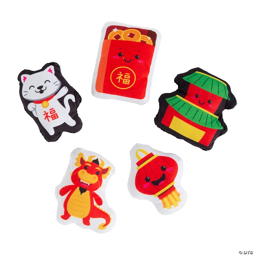 These happy plush toys come in Chinese New Year shapes including a lamp, a pagoda, a Meneki-neko, a dragon and more! Great as Chinese New Year handouts for kids, these flat plush toys are just the right size for small hands. Use these plush toys as party favors at your Chinese New Year celebration. (50 pcs. per unit) 4 1/2″ – 4 3/4″ Assortment may vary. © OTC